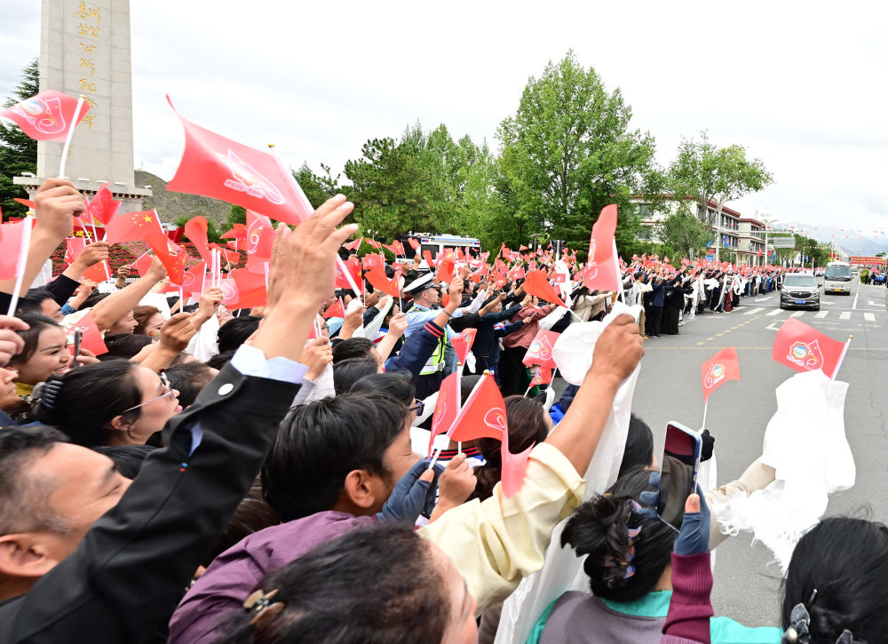 人群如潮水涌到道路兩旁,揮舞紅旗、手捧哈達,高呼“扎西德勒”,聲聲祝福是“感恩總書記、感恩黨中央”的由衷表達。習近平總書記拉開車窗,微笑著向人群揮手致意。