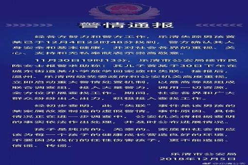 浙江省樂(lè)清市公安局官方微博5日凌晨發(fā)布警情通報(bào)稱(chēng),經(jīng)各方努力和警方工作,樂(lè)清失蹤男孩黃某已于12月4日22時(shí)48分找到,警方確認(rèn)其人身安全和基本健康,并對(duì)社會(huì)……