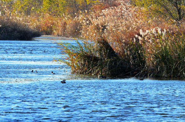 水鳥在濕地覓食、游弋(11月17日攝)。初冬時節(jié),山東省萊西市姜山濕地碧波蕩漾,成片蘆葦隨風(fēng)搖曳,數(shù)以千計的鳥兒在蘆葦叢中棲息、飛翔。該濕地總面積達2萬畝,……