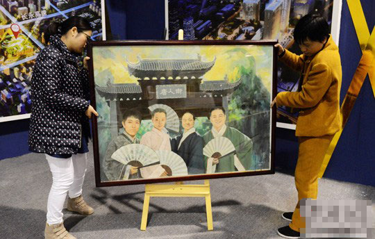 11月18日,旅法女性油畫家王俊英的作品《新四大美男圖》亮相長沙798紅館。畫中莫言、李玉剛、劉翔、陳光標(biāo)分別以“智慧之美”、“俊朗之美”、“……