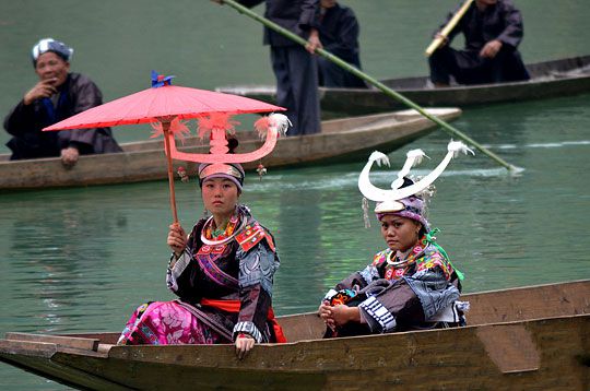 圖為船頭撐傘的苗族新娘。中新社發(fā) 趙剛 攝貴州省黔南布依族苗族自治州三都縣打魚鄉(xiāng)苗族村寨來術村一直奉行著古老的“水上送親”婚俗,每當舉行“水上送親、……