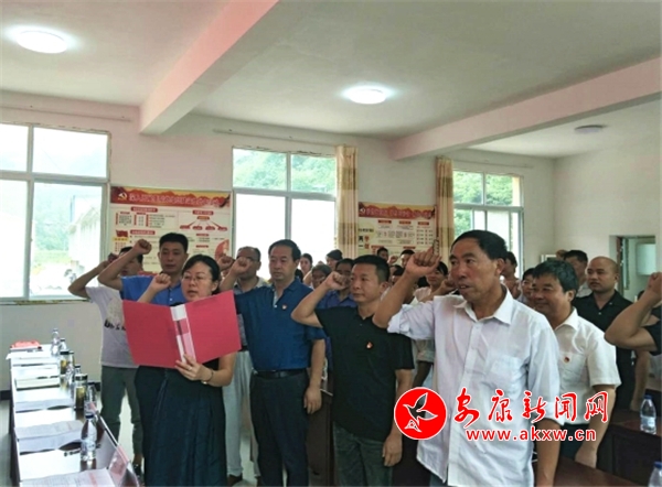 “我志愿加入中國(guó)共產(chǎn)黨,擁護(hù)黨的綱領(lǐng),遵守黨的章程……”7月17日,在老莊溝村二樓會(huì)議室里,來(lái)自市中心血站的20多名黨員干部與老莊溝村全體黨員統(tǒng)一佩戴黨徽,整齊列隊(duì),舉起右手,在黨旗下莊嚴(yán)宣誓,重溫入黨誓詞。