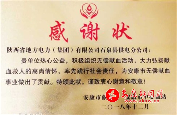 幾年來,石泉縣供電分公司無(wú)償獻(xiàn)血活動(dòng),得到上級(jí)組織的從分肯定。 2016年石泉縣供電分公司受到邀請(qǐng),參加了紀(jì)念“6.14”世界獻(xiàn)血者日,安康市人民政府舉辦的全市無(wú)償獻(xiàn)血促進(jìn)會(huì),作了無(wú)償獻(xiàn)血工作經(jīng)驗(yàn)交流發(fā)言,作為全市唯一的企業(yè)代表,電力人深感自豪和光榮;同年被安康市無(wú)償獻(xiàn)血領(lǐng)導(dǎo)小組辦公室、安康市紅十字會(huì)、安康市衛(wèi)生和計(jì)劃生育局聯(lián)合授予“安康市無(wú)償獻(xiàn)血愛心合作單位”,成為石泉縣第一家被授予無(wú)償獻(xiàn)血愛心合作的單位;2017年榮獲“市級(jí)無(wú)償獻(xiàn)血工作促進(jìn)獎(jiǎng)先進(jìn)集體”;2018年12月安康市、安康市中心血站送來“感謝狀”這一系列成績(jī)的取得為石泉縣供電分公司省級(jí)精神文明標(biāo)兵單位增色添彩,同時(shí)石泉縣供電分公司也是全縣僅此一家“省級(jí)精神文明標(biāo)兵單位”保持者,公司更高的目標(biāo)是創(chuàng)建“全國(guó)精神文明單位”這是幾代石泉電力人的夢(mèng)想。