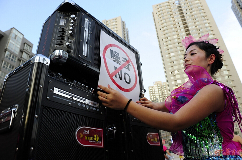 昨晚7時(shí)許,西安市未央?yún)^(qū)百花家園小區(qū),眾多廣場(chǎng)舞愛好者一起向廣場(chǎng)舞的音箱貼標(biāo)語,向噪音說“No”。