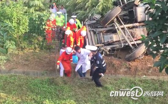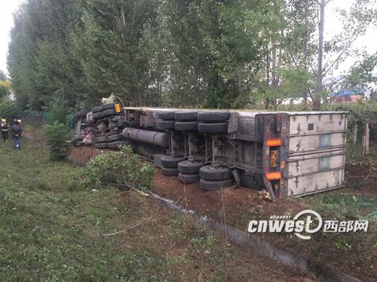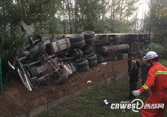 西寶高速一半掛車側翻2人被困 消防緊急救援
