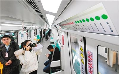 與目前開通的地鐵三條線路列車不同,四號線列車的座位旁邊沒有設置玻璃擋板,顯得更加開闊。報站的屏幕顯示著當前實時時間、本趟列車終點站以及下一站,29座車站的字體變大,紅色燈表示已經走過的車站,綠色燈表示將要到達的車站,讓乘客更易看清。