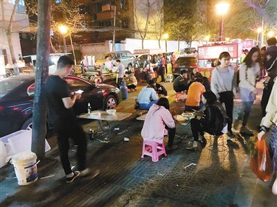 4月1日晚8時(shí)許,記者來(lái)到交大街,蘭蒂斯城小區(qū)門前熱鬧不已。麻辣燙、砂鍋、炒面、餃子、餛飩、米線、臭豆腐……各種小吃應(yīng)有盡有,近20個(gè)小攤販把小區(qū)門前的人行道包圍得水泄不通。每個(gè)小吃攤都有不少食客,生意紅火的同時(shí),地面上卻是一片狼藉。