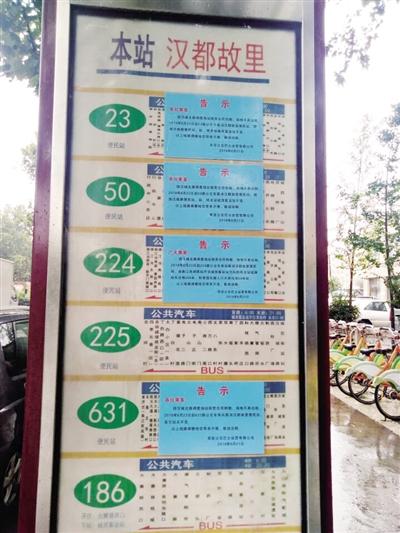 王女士說,她家住在漢城北路漢都故里小區(qū),門前有6條公交線,她在土門上班,每天乘坐23路和631路就可直達(dá)單位附近,十分方便?墒,8月20日下班回到小區(qū)門口的公交車站時,發(fā)現(xiàn)有224路、50路、23路、631路公交站牌上貼著一張告示稱: 8月23日起,這4條公交線路取消漢都故里便民站!皾h城北路沿線除了漢都故里小區(qū)外,還有雅卓花園、簡約花園和風(fēng)尚馨筑等多個居民小區(qū),涉及的居民比較多,一下子取消了4條公交線,將會給多少人的出行帶來不便?”王女士說,8月23日早上,她在小區(qū)門口公交車站準(zhǔn)備乘坐公交車去上班時,發(fā)現(xiàn)只剩下225路和186路,另外4趟公交車均不見蹤影。她朝南步行了10分鐘左右來到城西客運(yùn)站時,發(fā)現(xiàn)這4條線路的起點站原來被挪移到了此處。