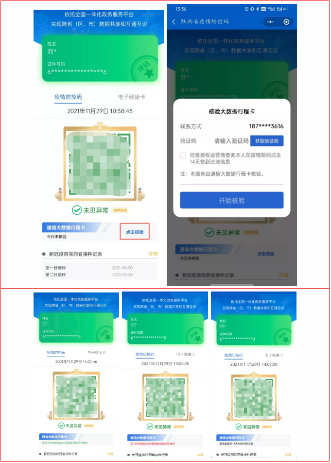 居民可在微信或支付寶中打開陜西健康碼小程序的“我的防控碼”界面,就能看到在防控碼下方專有一欄“通信大數(shù)據(jù)行程卡”,“點(diǎn)擊核驗(yàn)”即可根據(jù)陜西疫情防控碼所綁定手機(jī)號查詢最近14天是否到過中高風(fēng)險(xiǎn)地區(qū)。并且疫情防控碼頁面上僅保留當(dāng)日的核驗(yàn)結(jié)果,如第二天使用需要再次點(diǎn)擊核驗(yàn)。