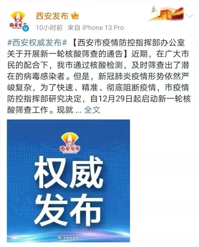 12月29日,西安市疫情防控指揮部辦公室發(fā)布關(guān)于開展新一輪核酸篩查的通告,近期,在廣大市民的配合下,西安市通過核酸檢測,及時(shí)篩查出了潛在的病毒感染者。但是,新冠肺炎疫情形勢依然嚴(yán)峻復(fù)雜,為了快速、精準(zhǔn)、徹底阻斷疫情,西安市疫情防控指揮部研究決定,自12月29日起啟動(dòng)新一輪核酸篩查工作。