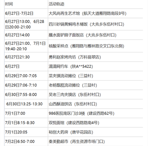 7月2日0-18時,西安市新增1例本土確診病例,系重點人群核酸篩查中發(fā)現(xiàn)。6月19日、21日、24日、28日核酸檢測結果均為陰性,7月2日7時40分混檢結果異常,7月2日13時,西安市疾病預防控制中心單檢結果陽性,經(jīng)市級專家組診斷為確診病例(輕型),主要活動軌跡如下:au7安康新聞網(wǎng)