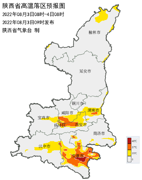 2022年8月3日10時(shí)00分,陜西省氣象臺(tái)發(fā)布高溫黃色預(yù)警 :受大陸高壓影響,3日榆林北部、關(guān)中大部、陜南大部地方有35℃以上的高溫天氣,其中咸陽(yáng)南部、楊凌、西安大部、渭南南部、漢中東部、安康部分地方可達(dá)37℃以上,安康平原地區(qū)局地可達(dá)40℃以上。