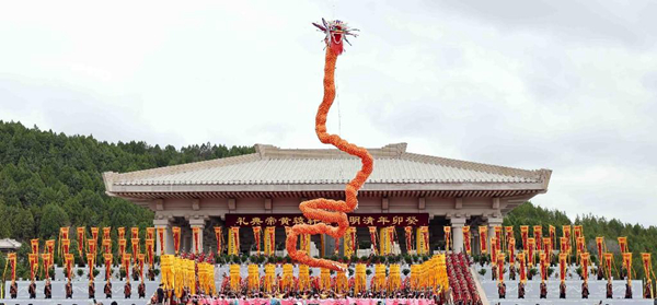 大風(fēng)泱泱,大潮滂滂,萬里山河,東風(fēng)浩蕩。在盛大的樂舞告祭中,一條長56米的“金色飛龍”從祭臺中心盤旋騰躍而起,承載著炎黃子孫對人文初祖無限崇敬與感恩之心、承載著實現(xiàn)中華民族偉大復(fù)興的中國夢,飛上云霄。