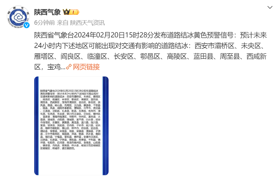 陜西省氣象臺(tái)2024年02月20日15時(shí)28分發(fā)布道路結(jié)冰黃色預(yù)警信號(hào),預(yù)計(jì)未來24小時(shí)內(nèi)下述地區(qū)可能出現(xiàn)對(duì)交通有影響的道路結(jié)冰: