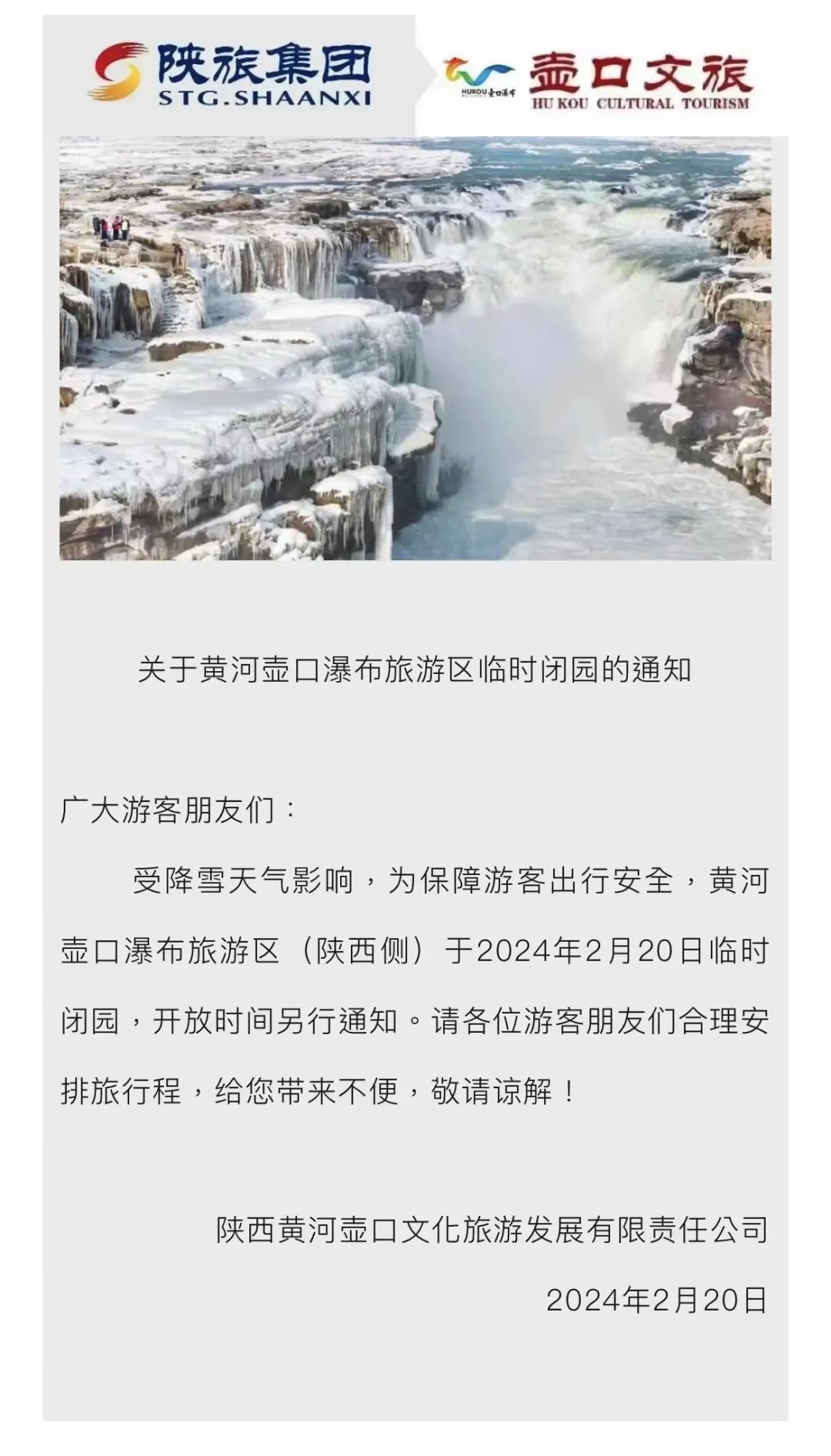 黃河壺口瀑布旅游區(qū)臨時(shí)閉園:受降雪天氣影響,為保障游客出行安全,黃河壺口瀑布旅游區(qū)(陜西側(cè))于2024年2月20日臨時(shí)閉園,開放時(shí)間另行通知。請(qǐng)各位游客朋友們合理安排旅行程,給您帶來不便,敬請(qǐng)諒解!