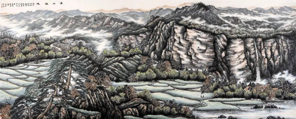 基于這樣的思考,一幅溪山作品的構(gòu)圖在腦海漸漸形成,它將是一幅以綠色為基調(diào)的青山綠水圖畫,是人與自然和諧共生的美麗情愫。全畫由近、中、遠(yuǎn)三部分構(gòu)成,以平視和仰視的角度分別體現(xiàn)。近景畫出幾塊巨大嶙峋的山石,配以年輪久遠(yuǎn)的古松和新植的翠松。背后是暮春的梯田、村落,小河邊有洗衣的婦女和在田間勞作的人們。這些符號(hào)結(jié)合在一起,所要表現(xiàn)的就是時(shí)空久遠(yuǎn)與現(xiàn)實(shí)的延伸,人與自然依然和諧共生共榮,增加現(xiàn)代生活氣息;中景突出巨碑式的丹霞層巖,巖上飛流而下的飛瀑,表現(xiàn)溪山的巍峨與壯觀,這是全畫中必須用心刻畫的細(xì)節(jié)。溪山的厚重、峻峭,都要通過有力的線條表現(xiàn)出來,增強(qiáng)溪山的氣勢(shì)和偉岸,但又要注意不能給人以壓抑感,要以云遮霧掩顯現(xiàn)它的神奇和神秘;遠(yuǎn)景是大山背后的遠(yuǎn)山層巒,分三層漸次疊加。最上一層是春暉映照的暖色遠(yuǎn)山,對(duì)整個(gè)的冷色基調(diào)形成對(duì)比和映襯,使畫面不至于過于沉郁?傊乙憩F(xiàn)的是春色之中磅礴而壯麗的溪山。