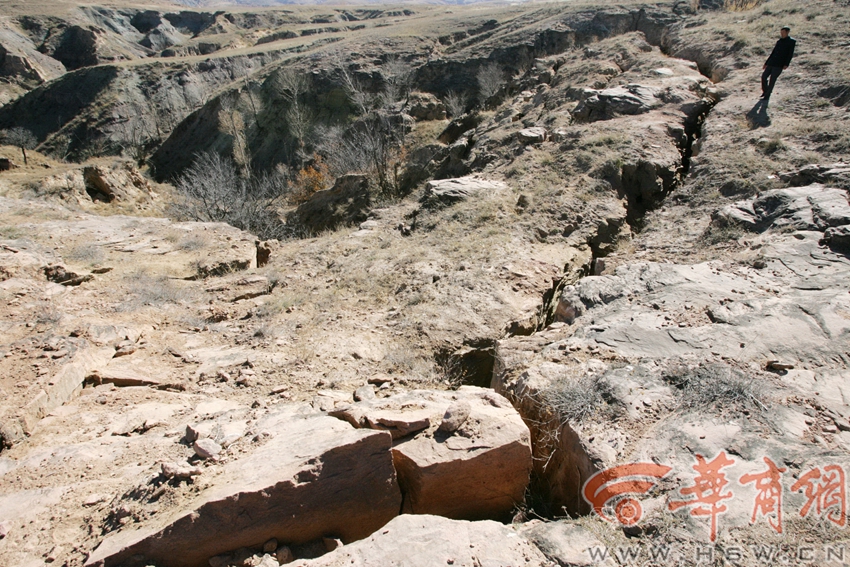 神木縣中雞鎮(zhèn)煤礦采空區(qū)地質(zhì)坍陷造成的裂縫長達數(shù)公里,因為地下水流失,地表草木苦干。本報記者 鄧小衛(wèi) 文/圖