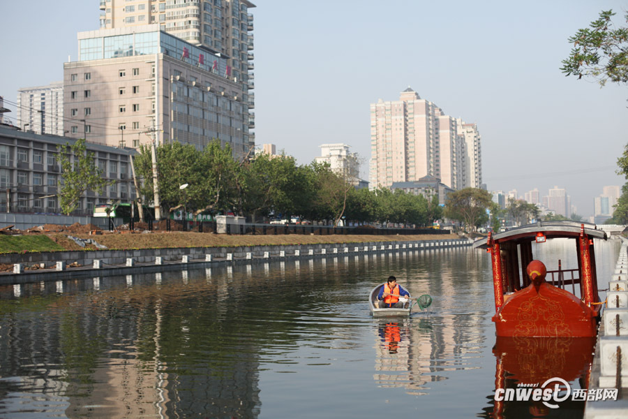 護城河里的保潔員一大早就開始工作,確保河面的清潔。