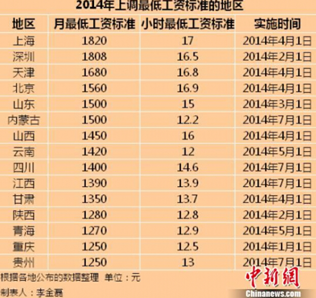 進(jìn)入7月份,四川、江西、貴州和內(nèi)蒙古均上調(diào)了最低工資標(biāo)準(zhǔn)。據(jù)中新網(wǎng)記者不完全統(tǒng)計(jì),截至目前,2014年全國已有15個地區(qū)上調(diào)了最低工資標(biāo)準(zhǔn)。從絕對數(shù)上看,上!