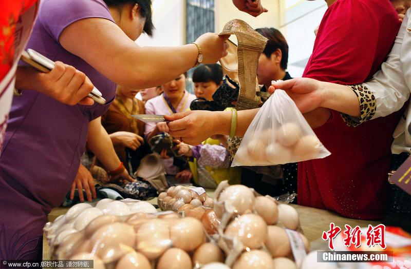 5月25日下午3時許,陜西省西安市鳳城五路一商場大廳里,很多人排起了長隊,每個人手中都拿著雞蛋。走近一問才知道,她們參加的是一個叫“雞蛋換‘胸’……