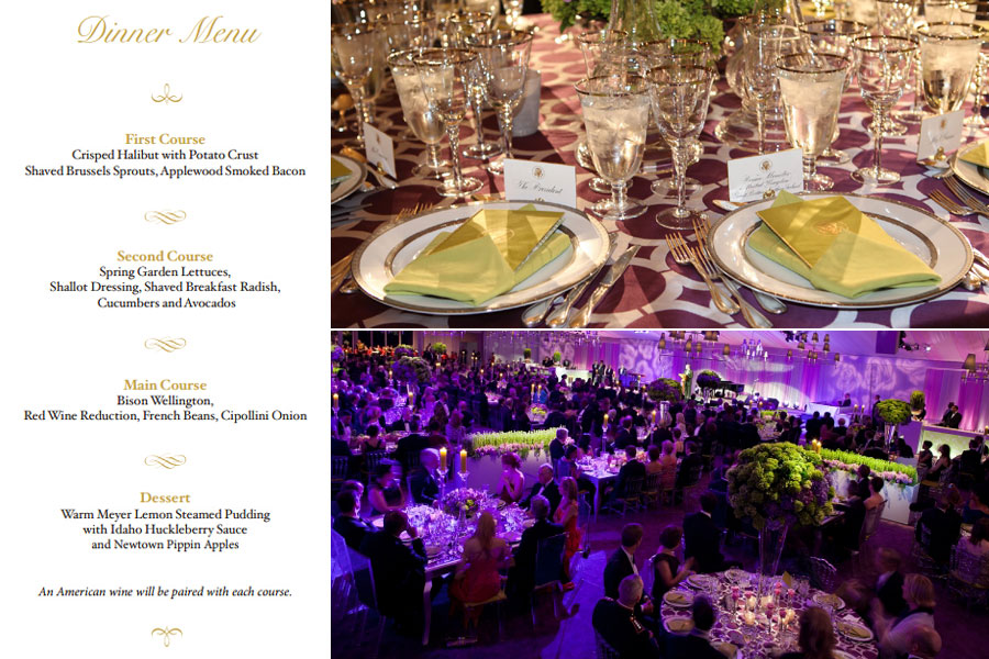 國(guó)宴的主題為“收獲”。第一道菜是炸比目魚配煎馬鈴薯,輔以采自白宮花園的新鮮嫩甘藍(lán)、布魯塞爾小包菜以及蘋果木熏肉。