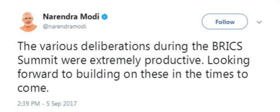 廈門會(huì)晤期間,印度總理莫迪關(guān)于“金磚”發(fā)了至少15條推文。會(huì)晤一結(jié)束,莫迪連發(fā)6條推文,介紹參會(huì)成果,其中3條是這么說的: