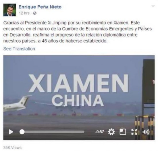 墨西哥總統(tǒng)培尼亞參加了5日召開的新興市場(chǎng)國(guó)家與發(fā)展中國(guó)家對(duì)話會(huì),商討“金磚+”合作。他在臉譜賬號(hào)上發(fā)文說:“感謝習(xí)近平主席在廈門的款待。在新興市場(chǎng)國(guó)家與發(fā)展中國(guó)家對(duì)話會(huì)期間(與習(xí)主席)的會(huì)晤,在(墨中)建交45周年之際,加深了我們兩國(guó)之間的外交關(guān)系。”
