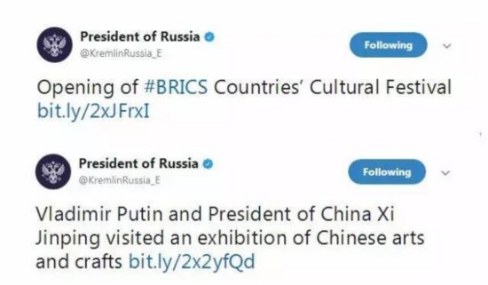 克里姆林宮推特官方賬號(hào)則發(fā)了兩條關(guān)于俄羅斯總統(tǒng)普京出席文化交流活動(dòng)的推文,分別是普京參加金磚國(guó)家文化節(jié)和中國(guó)藝術(shù)品展。人文交流是此次廈門會(huì)晤上推進(jìn)金磚合作的一大新支柱。