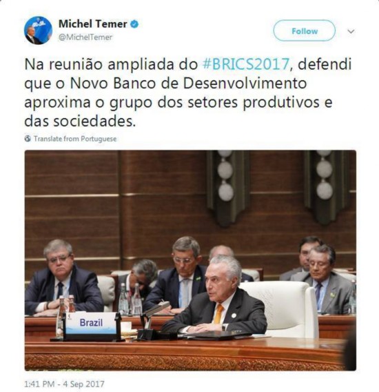 在其中一條推文中,特梅爾對(duì)新成立不久的金磚國(guó)家新開發(fā)銀行充滿期待。他說自己在4日的金磚國(guó)家領(lǐng)導(dǎo)人廈門會(huì)晤大范圍會(huì)議中呼吁新開發(fā)銀行把生產(chǎn)部門和社會(huì)更緊密地聯(lián)結(jié)在一起。