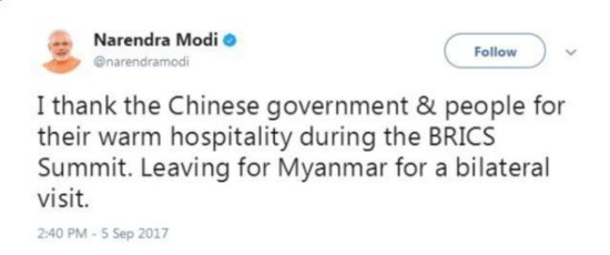 “感謝中國(guó)政府和人民在金磚國(guó)家領(lǐng)導(dǎo)人會(huì)晤期間的盛情款待。我即將動(dòng)身訪問緬甸!