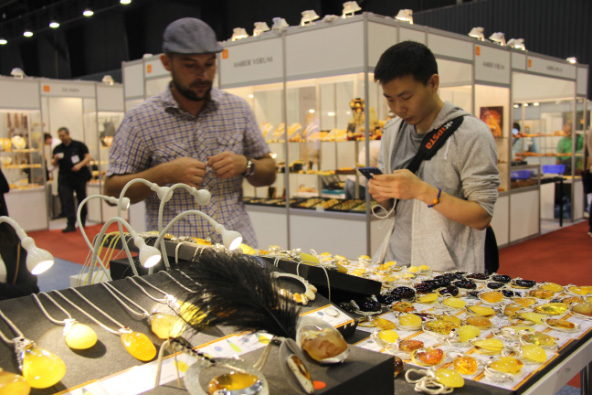 展區(qū)里,到處都能見到拿著小手電的中國買家在仔細(xì)品鑒琥珀珠寶,不少人拖著行李箱。很多中國進(jìn)貨商拿著手機(jī)對琥珀首飾一陣拍,只要微信那端客戶點(diǎn)頭,買賣馬上成交。展會(huì)上只收現(xiàn)金,不少中國買家把身上所有現(xiàn)金花光,只能相互“拆借”,或找當(dāng)?shù)厝A商用人民幣換歐元或茲羅提。
