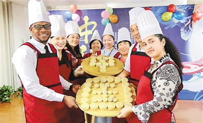 9月26日,山東省東營市東營區(qū)勝利街道勝景社區(qū)居民活動(dòng)室里,山東科瑞控股集團(tuán)的兩名外籍員工姆吉卡(右)、阿莫德(左)和社區(qū)居民在專業(yè)糕點(diǎn)師指導(dǎo)下學(xué)習(xí)制作月餅,迎接中國國慶和中秋佳節(jié)的到來。xB2安康新聞網(wǎng)
