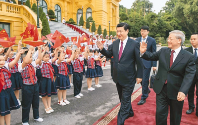 會談前,阮富仲在主席府廣場舉行盛大歡迎儀式。廣場外簇?fù)碇碇褡宸b迎候習(xí)近平的當(dāng)?shù)孛癖姟A?xí)近平乘車抵達(dá)時(shí),越南少年兒童揮舞著中越兩國國旗熱烈歡迎習(xí)近平到來。阮富仲在停車處迎接,越南兒童向習(xí)近平獻(xiàn)上鮮花。習(xí)近平同阮富仲登上檢閱臺。軍樂隊(duì)奏中越兩國國歌,鳴21響禮炮。習(xí)近平在阮富仲陪同下檢閱儀仗隊(duì)。全體儀仗隊(duì)員用越南語高呼“?倳浬眢w健康”。習(xí)近平同越方陪同人員握手,阮富仲同中方陪同人員握手。習(xí)近平和阮富仲返回檢閱臺,觀看分列式。兩國領(lǐng)導(dǎo)人前往越共中央駐地時(shí),越南青年拋撒花瓣歡迎。