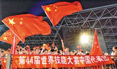 圖為日前在阿拉伯聯(lián)合酋長國舉行的第44屆世界技能大賽開幕式上,人們揮舞著中國國旗歡迎中國代表團(tuán)入場。uvR安康新聞網(wǎng)