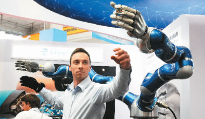 8月24日,北京亦創(chuàng)國(guó)際會(huì)展中心機(jī)器人大會(huì)上,一位德國(guó)的技術(shù)人員在展示機(jī)器人。fDs安康新聞網(wǎng)