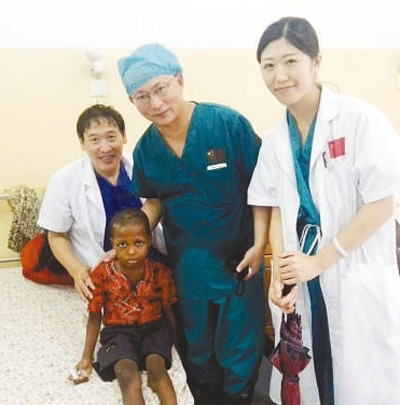 楊鐵軍這次到達(dá)幾內(nèi)亞后實(shí)施手術(shù)的第一例患者是一名6歲兒童。這位兒童遭遇了車禍,傷勢(shì)嚴(yán)重,右上肢和下肢都有骨折、右股骨粉碎性骨折。小患者已經(jīng)住了很久醫(yī)院,但是當(dāng)?shù)卮蠓虿恢廊绾谓o這個(gè)孩子治療,只能暫時(shí)用石膏固定病肢。在楊大夫給小患者成功手術(shù)后僅兩周,小患者右上肢石膏已拆除,活動(dòng)自如。孩子父母對(duì)中國(guó)醫(yī)療隊(duì)的感激溢于言表,孩子天真稚氣的小臉上又重現(xiàn)了往日的歡樂笑容。