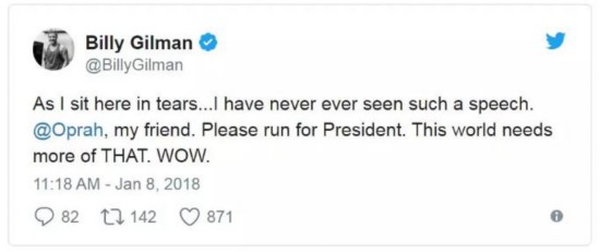 Billy Gilman:我現(xiàn)在坐在這兒淚流滿面……我從來沒聽過這樣的演講,奧普拉,我的朋友,請(qǐng)競(jìng)選總統(tǒng)吧,這個(gè)世界需要更多這樣的聲音。