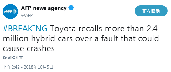 【環(huán)球網(wǎng)報道 記者 崔舒飛 張飛揚(yáng)】據(jù)法新社5日最新消息,因發(fā)現(xiàn)存在可導(dǎo)致車禍的錯誤,豐田汽車公司召回超過240萬輛混合動力車。