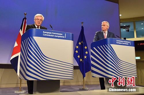 當(dāng)?shù)貢r間3月19日,脫歐談判歐盟首席談判代表巴尼耶(圖右)與英國脫歐事務(wù)大臣戴維斯(圖左)共見記者,宣布雙方邁出“決定性一步”,就脫歐過渡期安排等議題達成協(xié)議,但棘手的英國北愛爾蘭與愛爾蘭邊界問題仍懸而未決。中新社記者 德永健 攝