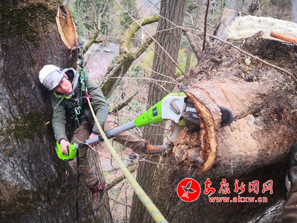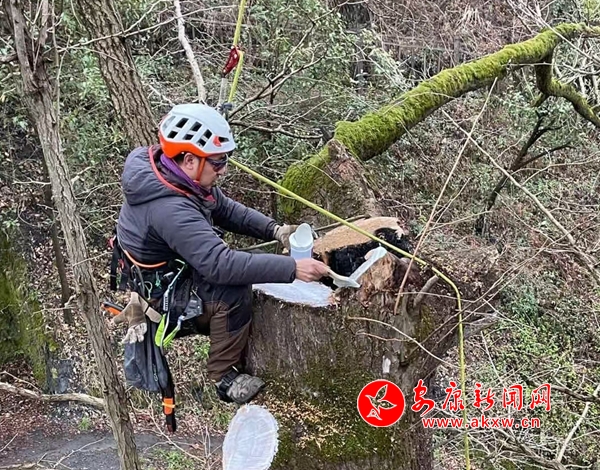 “在修復(fù)期間,我們聘請(qǐng)了國(guó)內(nèi)最頂尖的攀樹(shù)師、修剪師,攀登到樹(shù)頂,對(duì)樹(shù)體的枯枝、病腐枝進(jìn)行了清理,然后對(duì)所有樹(shù)洞存在腐爛的地方,使用消毒滅菌的藥物進(jìn)行處理,對(duì)影響樹(shù)體生長(zhǎng),可能造成二次傷害位置的漏洞、樹(shù)洞進(jìn)行了封堵。我們使用的攀樹(shù)、修剪技術(shù)目前在我們陜西省內(nèi)屬于首次的應(yīng)用,通過(guò)這次修剪之后讓陽(yáng)光照進(jìn)傷口,使古樹(shù)再次萌發(fā)了蓬勃生長(zhǎng)的動(dòng)力”,白河縣林業(yè)局自然保護(hù)地管理辦公室主任肖培軍介紹說(shuō)。