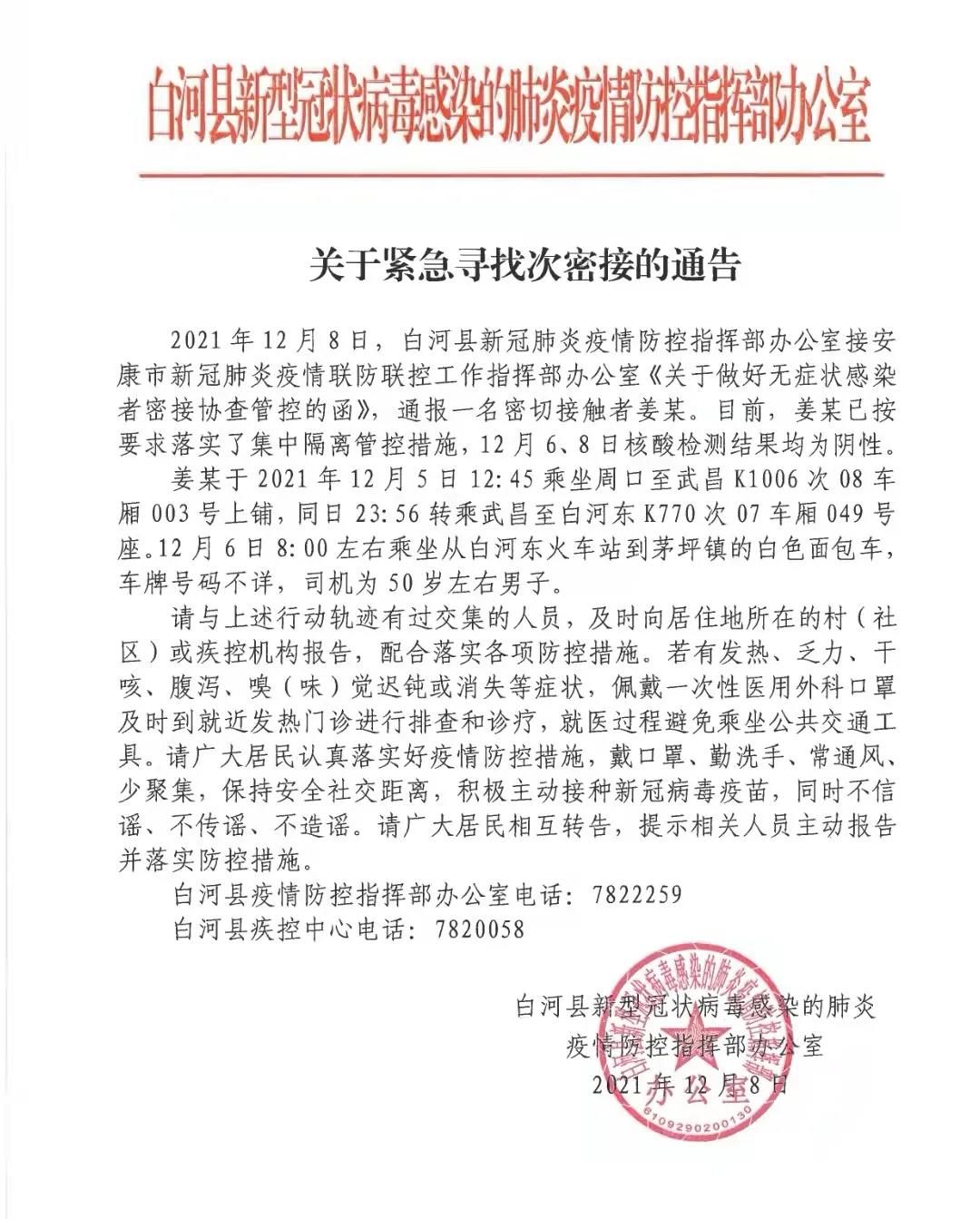 2021年12月8日,白河縣新冠肺炎疫情防控指揮部辦公室接安康市新冠肺炎疫情聯(lián)防聯(lián)控工作指揮部辦公室《關(guān)于做好無(wú)癥狀感染者密接協(xié)查管控的函》,通報(bào)一名密切接觸者姜某。目前,姜某已按要求落實(shí)了集中隔離管控措施,12月6、8日核酸檢測(cè)結(jié)果均為陰性。
