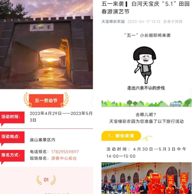 景區(qū)景點(diǎn)開放到位。“五一”期間,3家A級(jí)景區(qū)景點(diǎn)全部正常開放。其中天寶4A景區(qū)從4月29日至5月3日籌備舉辦田園春游演藝節(jié)系列活動(dòng),推出門票七折優(yōu)惠措施;廟山寨3A景區(qū)將舉辦“廟山”好聲音、攀巖比賽等節(jié)慶活動(dòng),推出138元游玩通票打五折、門票+餐飲立減等優(yōu)惠措施。