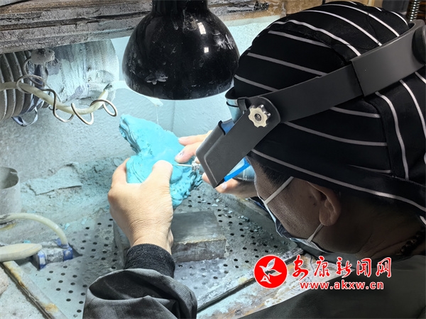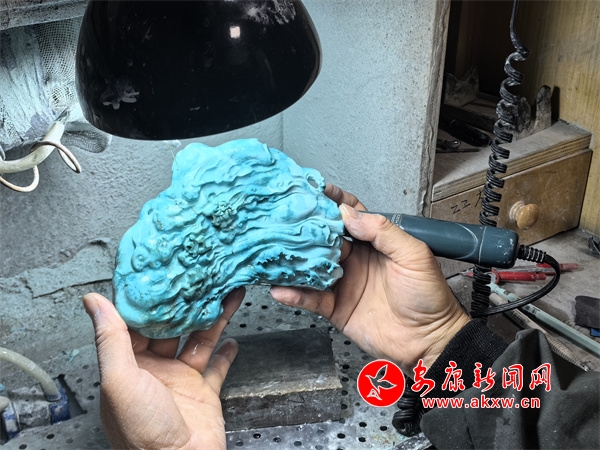 中國寶石琢玉藝術(shù)家徐安對白河綠松石進行雕刻