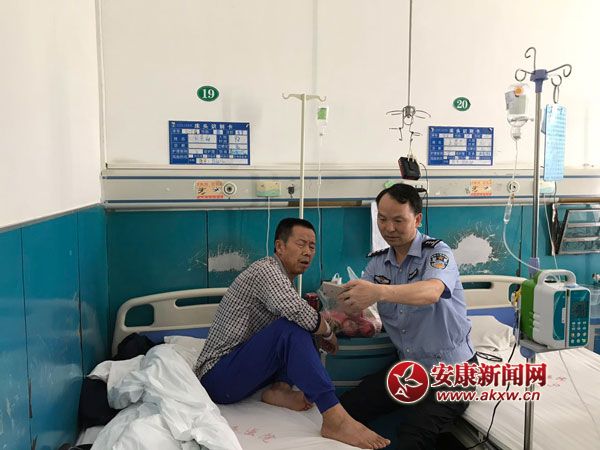 病床前的暖心扶貧。該圖為白河交警大隊(duì)民警帶著水果入院看望低保貧困戶,并熱情耐心向其講解健康扶貧政策,鼓勵(lì)殘疾單身老人挺過難關(guān)堅(jiān)定生活信心。攝影 楊鳴……