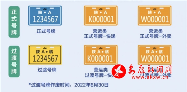 電動(dòng)自行車(chē)號(hào)牌號(hào)碼均為7位數(shù)字。正式的電動(dòng)自行車(chē)號(hào)牌底色為藍(lán)色,字體和框線為白色;過(guò)渡號(hào)牌底色為黃色,字體和框線為黑色。營(yíng)運(yùn)類(lèi)號(hào)牌底色為橘色,字體和線框?yàn)榘咨?/span>