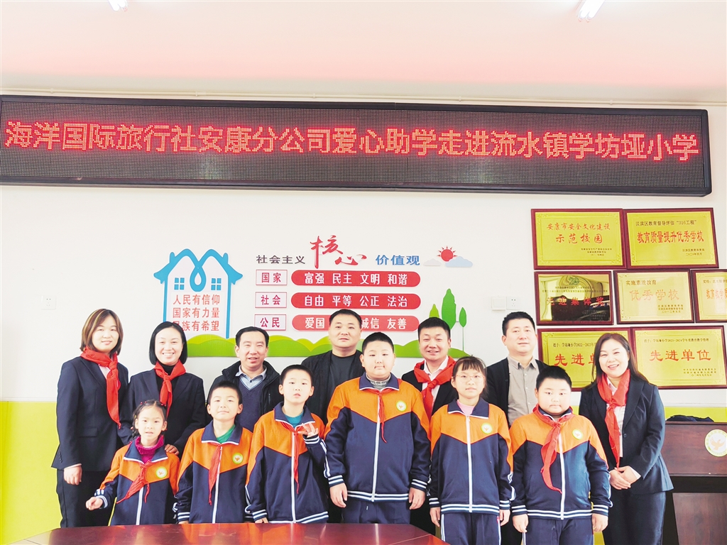 捐贈(zèng)儀式上,學(xué)坊埡小學(xué)少先隊(duì)員為海洋國際旅行社安康分公司的愛心人士系上紅領(lǐng)巾,歡迎他們的到來。隨后,愛心人士們把一份份愛心大禮包送到孩子們手中,鼓勵(lì)他們克服困難、努力學(xué)習(xí)。孩子們感動(dòng)之余紛紛表示,一定珍惜這份來自社會(huì)大家庭的關(guān)愛,將會(huì)更加努力學(xué)習(xí),力爭(zhēng)早日成為國家有用之才。據(jù)了解,此次活動(dòng)海洋國際旅行社安康分公司共為學(xué)坊埡小學(xué)捐贈(zèng)助學(xué)物資近萬元,其中包括秋季校服、學(xué)習(xí)用品及愛心大禮包等,惠及該校多名學(xué)生。