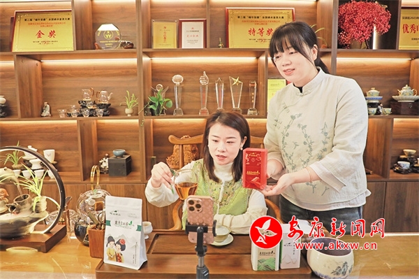 李靜與助手在直播間推介富硒紅茶