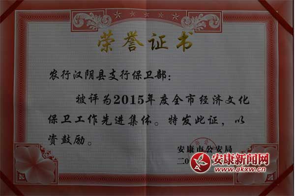安康新聞網(wǎng)訊 (通訊員 吳玄杰)近日,陜西省公安廳、省綜治委聯(lián)合下發(fā)了《關(guān)于命名表彰2015年度全省經(jīng)文保系統(tǒng)省級“平安示范單位”“平安單位”的決定》,農(nóng)行漢陰縣支行被授予省級“平安單位”榮譽(yù)稱號。同時,安康市公安局下發(fā)了《安康市公安局關(guān)于表彰2015年度全市經(jīng)濟(jì)文化保衛(wèi)工作先進(jìn)集體和先進(jìn)個人的決定》,農(nóng)行漢陰縣支行保衛(wèi)部獲得“2015年度全市經(jīng)濟(jì)文化保衛(wèi)工作先進(jìn)集體”榮譽(yù)稱號,保衛(wèi)部經(jīng)理鄺吉祥同志被市公安局評為“先進(jìn)個人”。