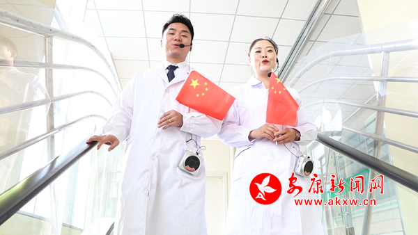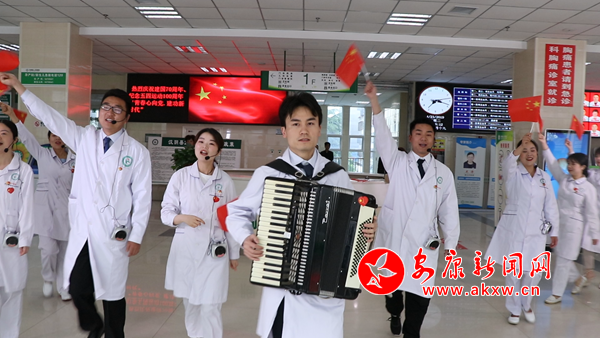 當日8點20,一名醫(yī)生從科室中取出手風琴,來到大廳中開始演奏。隨著樂曲響起,一位位手持小紅旗、胸嵌黨徽的醫(yī)護人員從人群中走出,他們或面對周圍觀眾,或互相對望,深情動人的歌聲讓現(xiàn)場觀眾備受感染,吸引越來越多的患者和路人駐足觀望。隨后,他們走出大廳,來到醫(yī)院門口,在這里,數百名醫(yī)護人員在歌聲中匯聚,一側高舉國旗,一側形成方陣,大家揮動著手中的小紅旗,一齊高聲歌唱著《我和我的祖國》。在清晨陽光的照射下,鮮艷的五星紅旗和“70”方隊格外醒目,大家齊聲高唱,歌聲經久不息,令人熱血澎湃、催人奮進。