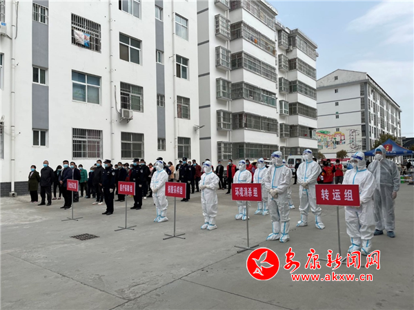 本次演練預(yù)設(shè)集鎮(zhèn)社區(qū)某單元存在一名境外返漢人員于居家隔離期間發(fā)熱,經(jīng)轉(zhuǎn)院隔離治療確診為新冠肺炎病例。社區(qū)迅速啟動應(yīng)急預(yù)案,對本單元住戶進行流調(diào)排查、進行全員核酸檢測篩查、疫點終末消殺、密接隔離、小區(qū)二期封控、雙乳村管控等措施。
